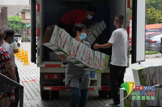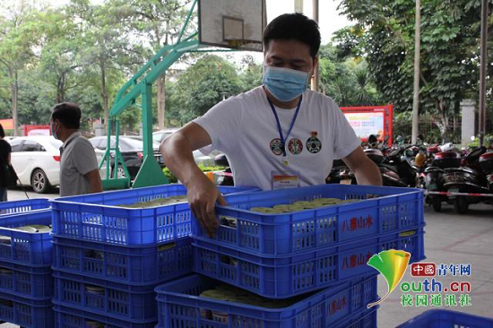图为随着活动的开展,一车又一车的扶贫农产品运到现场,实践队员帮助工作人员搬运货物。