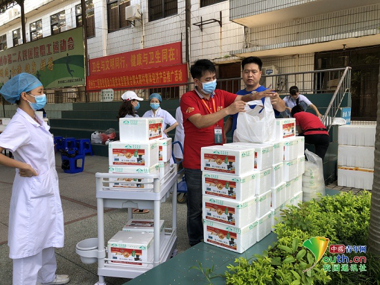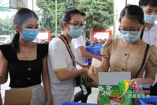 图为实践队队员在钦州市二医院门口参与扶贫销售。