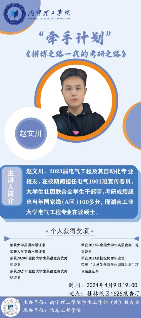 主讲人:赵文川,2023届级校友,电气工程及其自动化专业,考研成绩超出当年国家线(A区)100多分,现湖南工业大学电气工程专业在读硕士。