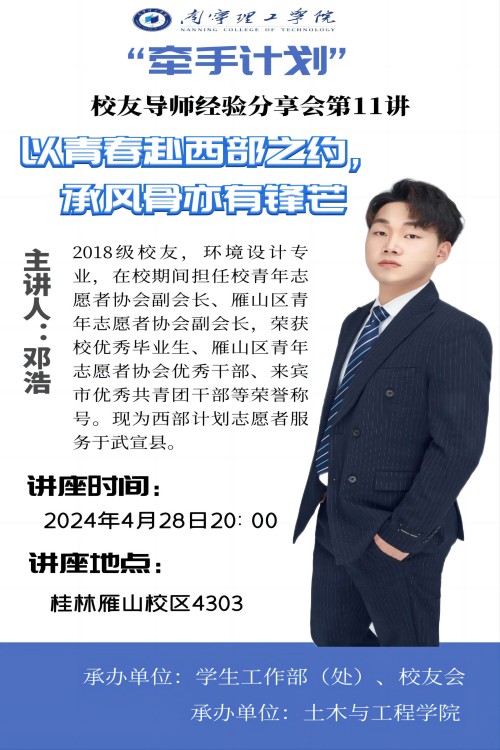 主讲人:邓浩,2018级校友,环境设计专业,在校期间担任校青年志愿者协会副会长、雁山区青年志愿者协会副会长,荣获校优秀毕业生、雁山区青年志愿者协会优秀干部、来宾市优秀共青团干部等荣誉称号。现为西部计划志愿者服务于武宣县。
