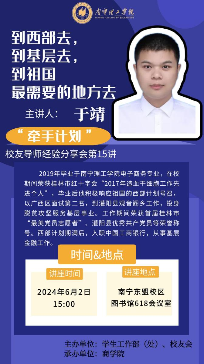 主讲人:于靖,男,2019年毕业于南宁理工学院电子商务专业,大学毕业他积极响应祖国的西部计划号召,以广西区面试第二名,到灌阳县观音阁乡工作,投身脱贫攻坚服务基层事业。期间有30余条新闻信息被市、县新闻媒体采用,为1000余人次办理业务。联系母校、相关部门在当地发展电商惠及群众50余户,工作表现优异。西部计划期满后,入职中国工商银行,从事基层金融工作。组织需要时主动申请到兴安县三桂村担任第一书记。任职期间,调解矛盾纠纷40余件,为民办实事100余件,带领村委班子摆脱后进,运用工行的兴农通app助售农产品近万元。全村21户脱贫户实现增收,争取到电脑8台,创建桂林首个村级党建+电子阅览室,丰富群众精神生活,得到了上级部门和当地群众的认可。