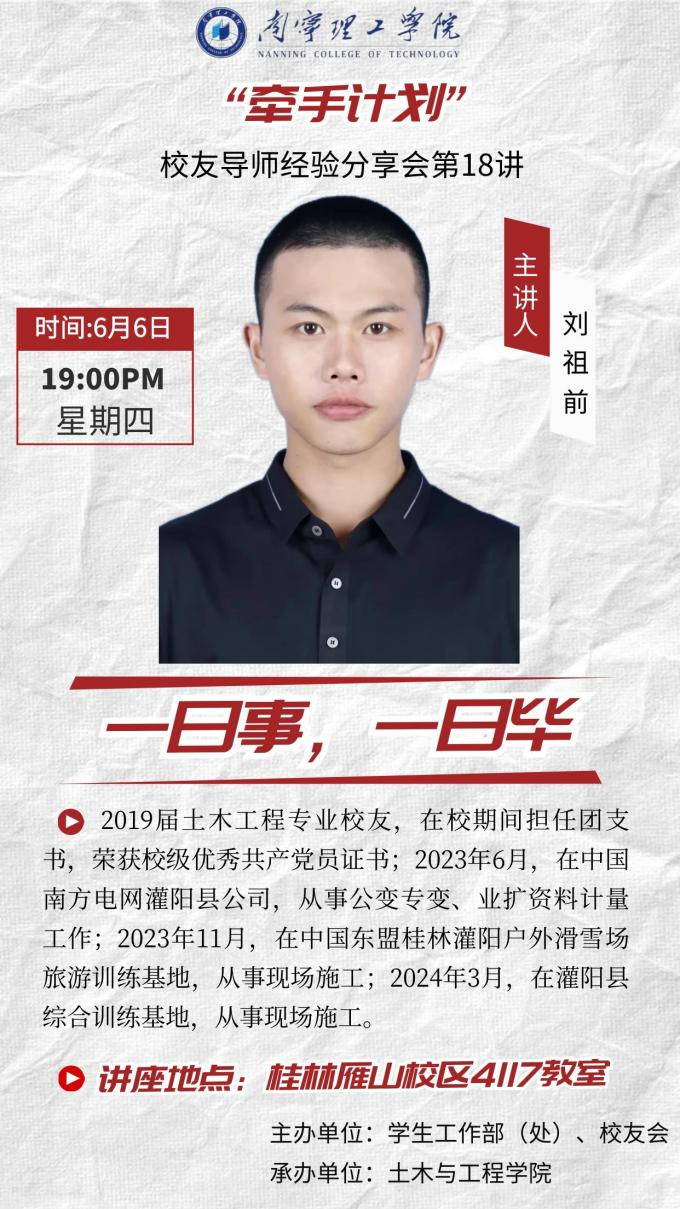 主讲人:刘祖前,2019届校友;2016年于广西建设职业技术学院专科学习土木工程专业,在校期间担任土木系学生会副部长、班级团支书、资助委员;2019年来到南宁理工本校进修土木工程专业,在校期间担任团支书,荣获校2021届优秀共产党员证书;2023年6月,中国南方电网灌阳县公司,从事公变专变、业扩资料计量工作;2023年11月,中国东盟桂林灌阳户外滑雪场旅游训练基地,从事现场施工;2024年3月,灌阳县综合训练基地,从事现场施工。