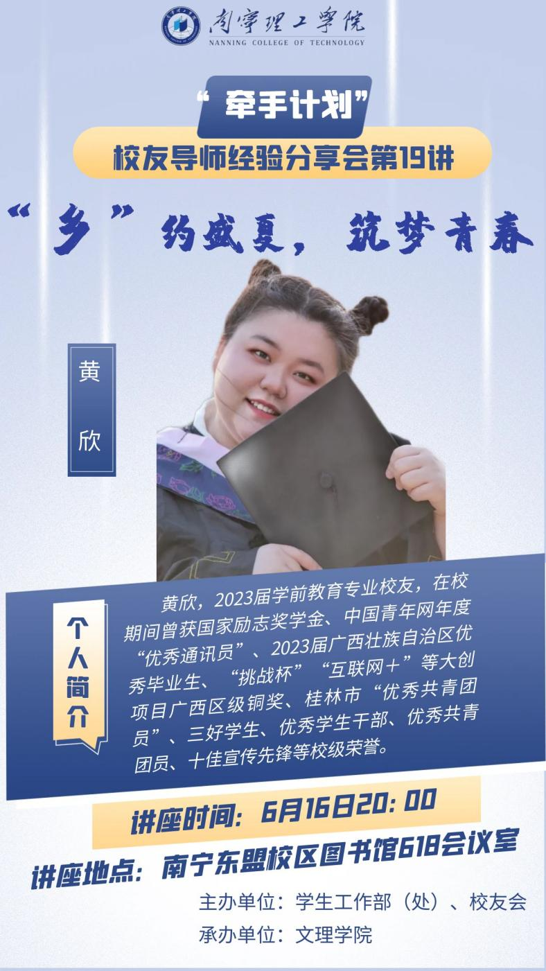 主讲人:黄欣,2023届校友,学前教育专业,在校期间担任2022年广西“青马工程”高校班宣传委员、广西微博渠道校园大使、校团委 学生会团委学生副书记、中国青年网校园通讯站站长、班级宣传委员,现就职于广西教育学会,目前借调至自治区教育厅基础教育处工作。