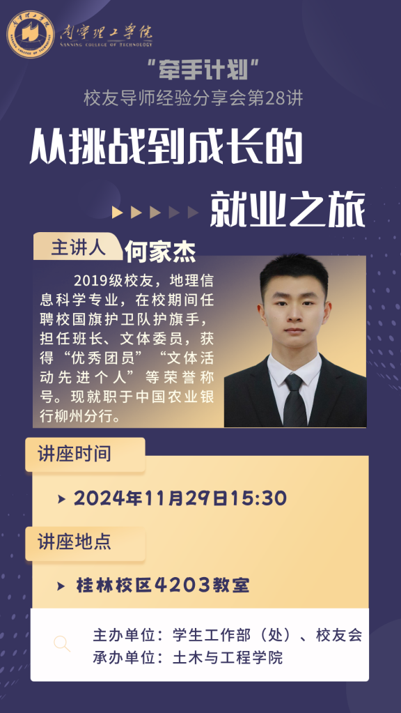 主讲人:何家杰,2019级校友,地理信息科学专业,现就职于中国农业银行柳州分行。