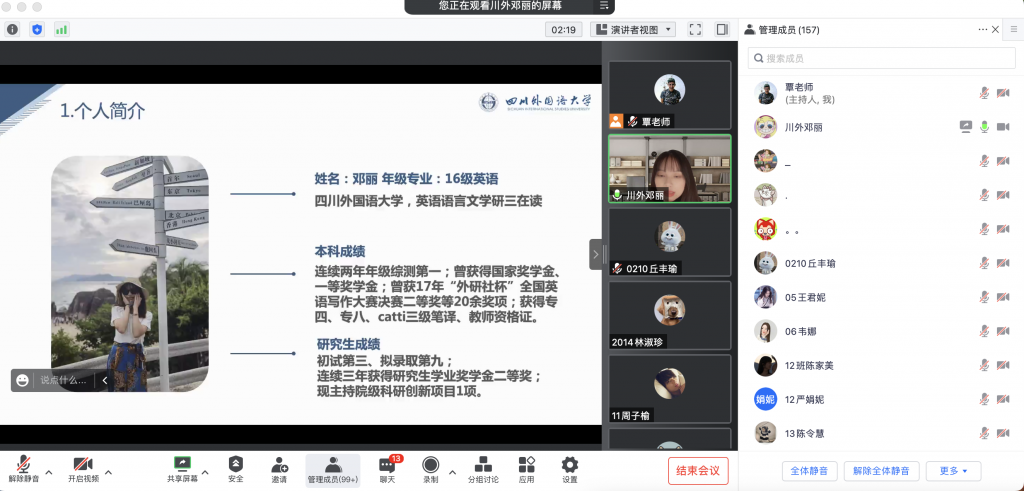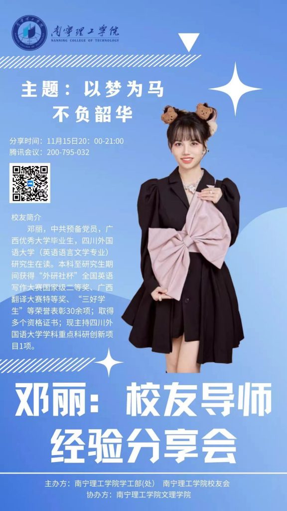 为进一步发挥各方校友力量,聘任一批在各行各业拔尖的人才作为校友导师,搭建学校优秀校友与在校学生互动交流的平台,使学生在视野开拓、职业发展、学业指导等方面受益匪浅,在提升在校生培养质量的同时,也促进了校友间的沟通联系。11月15日晚上,学工部(处)、校友会主办,文理学院承办的新生工程系列主题活动之一,牵手计划-校友导师经验分享会第一讲,邀请到邓丽学姐在腾讯会议线上为大家分享考研经验分享,助力考研圆梦。