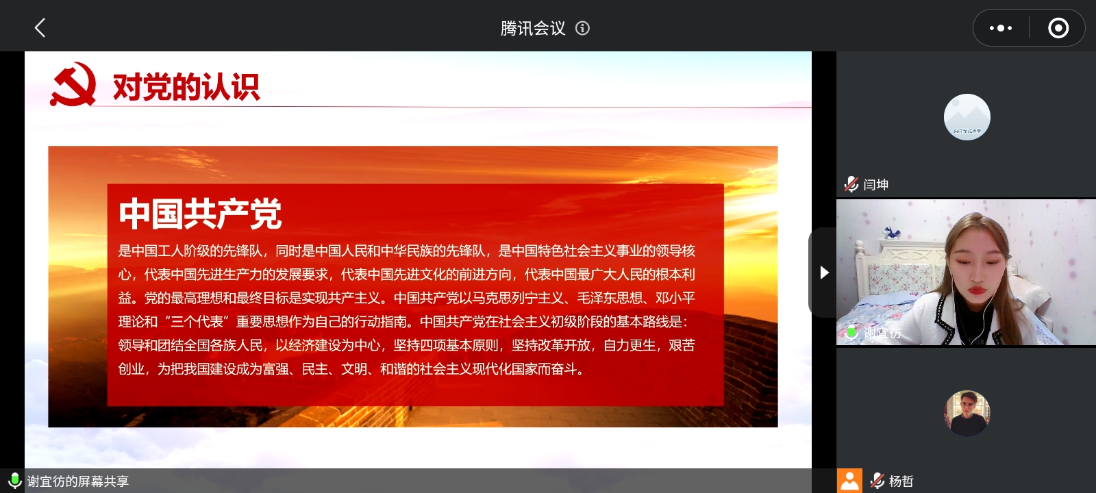 会议伊始,入党积极分子上台自我介绍并进行ppt展示,主要在自我介绍、入党动机、对党认识等几个方面分别进行阐述,接着由党支部书记、学生党支部成员进行提问,入党积极分子回答问题并对客观问题发表个人观点,最后由党支部书记作为答辩评委对答辩人的表现进行打分和记录。考察题目紧紧围绕入党动机、党性修养、党基本知识以及习近平总书记的重要讲话学习等时事热点问题,旨在考察入党积极分子对党课内容的学习和巩固,对党的认知程度以及在入党积极分子的学习中对党的政策的了解与个人实践情况。答辩过程中,所有的积极分子从容冷静、思维清晰、对答如流,在个人见解的阐述中不仅展现出大学生的基本道德修养,还展现出作为入党积极分子所具备的奉献精神,体现出良好的政治意识与较高的思想觉悟。最后,各学生党支部书记也对入党积极分子的见解作出补充改正,期望各位积极分子能在以后的学习生活中继续加强自身的能力和党性觉悟。