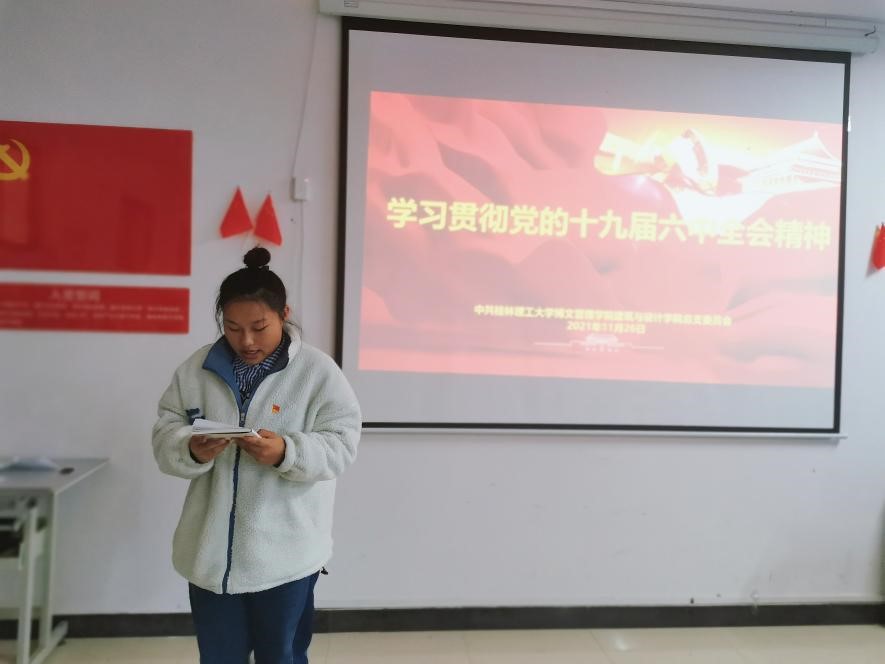 会议伊始,闫坤老师领学十九届六中全会主要精神,围绕党的十九届六中全会的召开背景和重要意义,表示党的十九届六中全会是立足我们党成立100周年的重要历史时刻,站在“两个百年”历史交汇的重大历史关头召开的重要会议,对推动全党进一步统一思想、统一意志、统一行动,团结带领全国各族人民夺取新时代中国特色社会主义新的伟大胜利,具有重大现实意义和深远历史意义,习总书记在会上的工作总结和报告内涵深远、立意深刻,为今后学院支部建设提供了理论依据,学生党员也将其作为党史学习教育的重要内容,营造浓厚的学习氛围。