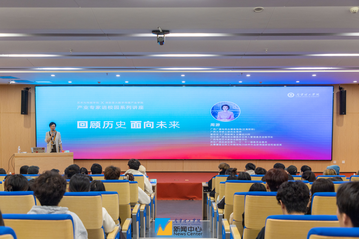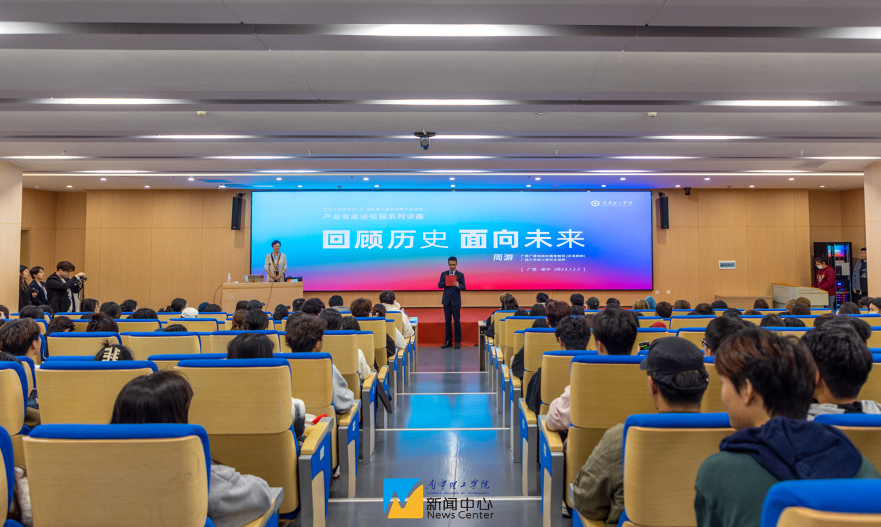 2023年12月1日上午,由南宁理工学院艺术与传媒学院联合微影星火数字媒体产业学院主办的“产业专家进校园”活动圆满结束。本次活动邀请到了广西广播电视台播音指导(正高职称),广西大学硕士研究生导师,曾担任《广西新闻》主播近20年,担任原广西电视台播音员主持人管理委员会秘书长,广西电视艺术家协会副秘书长,并任广西区政协第九、十、十一届委员会委员的周游为我院师生开展《回顾历史 面向未来》主题讲座。