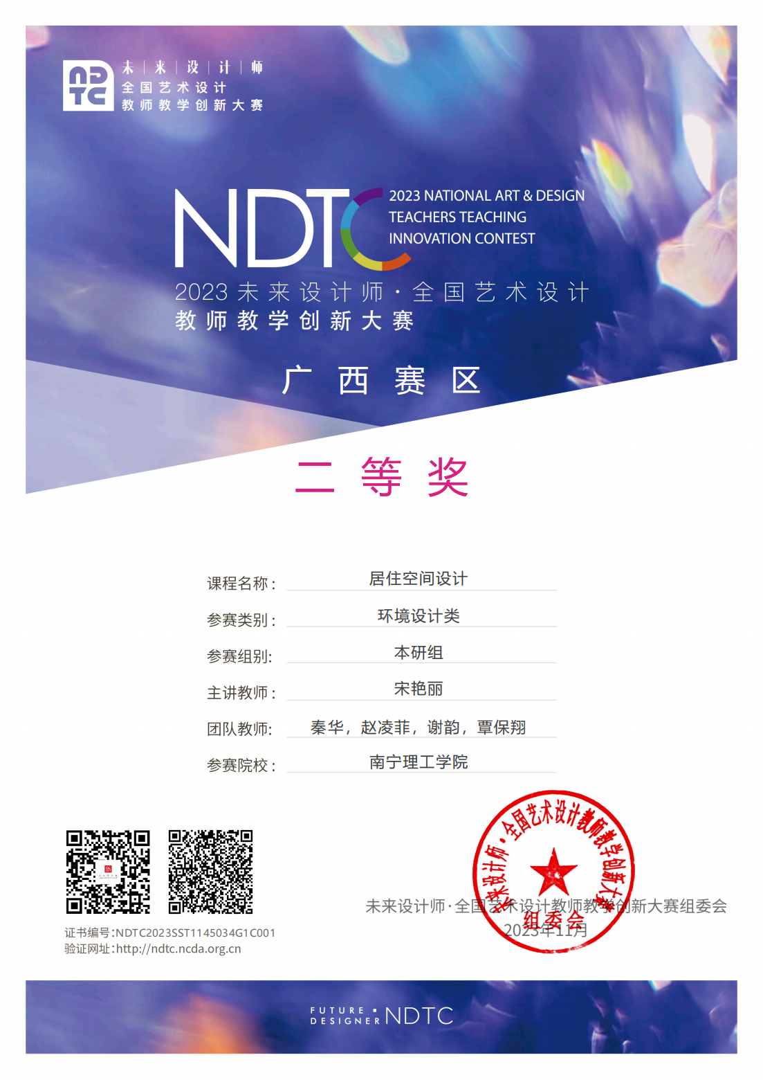 艺术与传媒学院环境设计专业教师宋艳丽老师带领覃保翔、谢韵、赵凌菲、秦华老师参加了教创赛课程团队组参加了比赛,以《居住空间设计》为参赛课程,获得了省部级二等奖好成绩,这是学院首个取得全国高校数字艺术设计大赛教师组《全国普通高校教师教学竞赛项目》的奖项,也是艺术与传媒学院在师资培养和师资教学创新能力的引力棒,未来学院将继续努力争取取得更好的成绩,恭喜宋艳丽老师课程团队获奖!