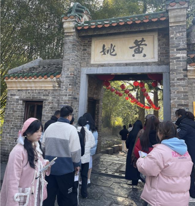 组织好学生入口合影后由老师带领有序检票进入古镇。古镇内可以观看到古镇完整的建筑布局。黄姚古镇同姓民居建筑多以祠堂为中心修建并向外辐射。黄姚古镇现有八大姓氏,九个宗祠,两个家祠,民居建筑多为同一姓氏围绕祠堂周围居住。古镇居民多为明末清初因避战乱或经商等原因迁徒至黄姚的移民,迁至黄姚后多以经商为生,家境普遍富裕。因此在住宅的建筑考虑上,更多的是出于抵御战乱与盗贼抢掠财物的防御与安全需要,无论是单体还是整体的建筑布局都有着较强的防御功能。建筑群的功能各有分区,龙畔街、中兴街主要是大户人家的生活区,安乐-金德-迎秀-连理-大然街是商业贸易区,姚江两岸的公共建筑是休闲娱乐区。