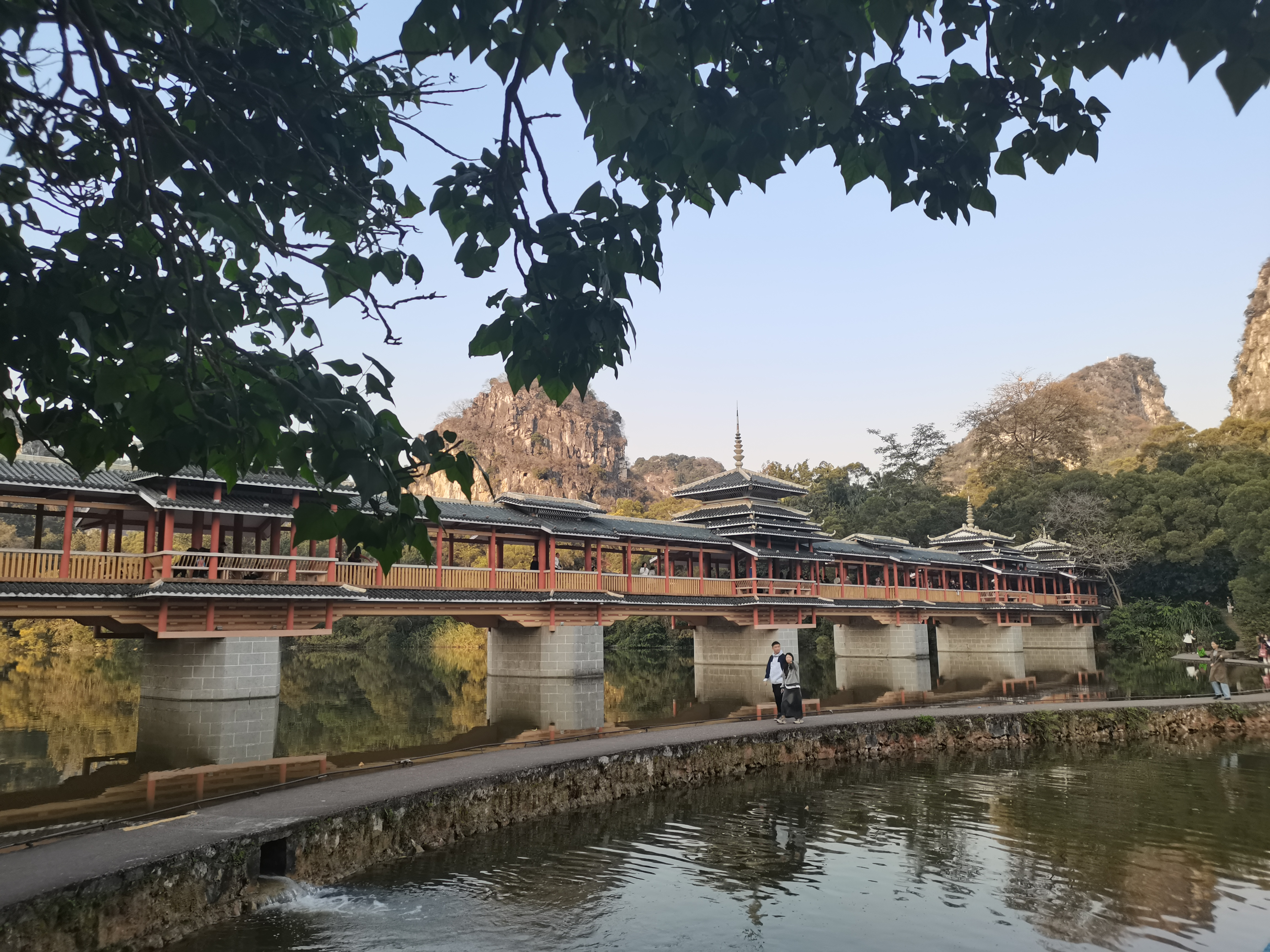 风雨桥,为侗族建筑“三宝”之一,是侗族建筑艺术的一朵奇葩。风雨桥桥梁由巨大的石墩、木结构的桥身、长廓和亭阁组合而成。除石墩外,全部为木结构,不用一钉一铁,全用卯榫嵌合。桥上建有塔形或殿形楼阁,楼阁之间,架梁盖瓦相连,形成长廊式建筑,内设长凳,供行人遮风避雨,休息乘凉,故名”风雨桥”。