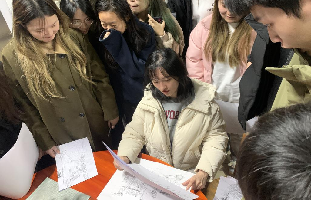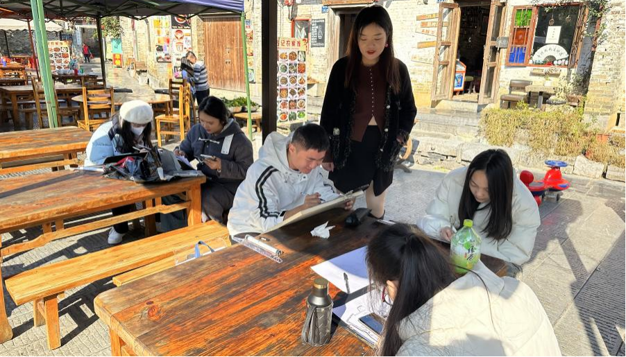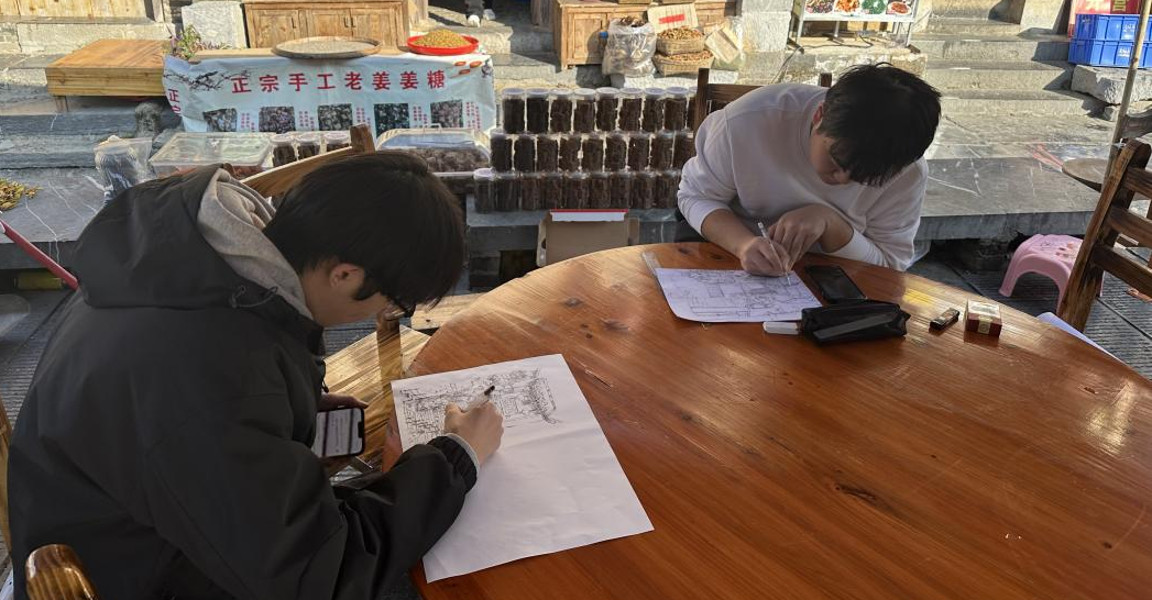 该日上午,师生们进入到古镇内部,学生们在专业教师的指导下,深入黄姚古镇的各个角落,不仅对当地的民居建筑进行了系统的考察与学习,同时还通过实地观察、测量、速写等方式进行学习与记录,对民居的建筑特点、空间布局、装饰元素、环境氛围等方面进行了全面又深入的了解与掌握。同时,教师团队也结合课程内容,引导学生们运用所学的手绘原理与技巧,以自己的方式,对民居进行深入而透彻的绘画与记录。