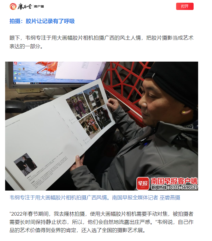 韦纲不仅是摄影领域的佼佼者,更是胶片摄影这一传统技艺的忠实拥趸。在报道中,韦纲不仅分享了自己多年来对胶片摄影这一传统技艺的执着追求,还通过精选的大画幅胶片相机作品,生动展现了广西这片热土的壮美风光与淳朴民风。这些作品不仅技术精湛,更蕴含着浓厚的文化情感与地域特色,每一帧画面都仿佛是一个穿越时空的窗口,让观众得以亲历那些被镜头定格的温暖瞬间,通过韦纲的镜头焕发出别样的生机与活力。这些作品不仅是对广西大地的艺术再现,更是对这片土地真挚与美好的深情颂歌。
