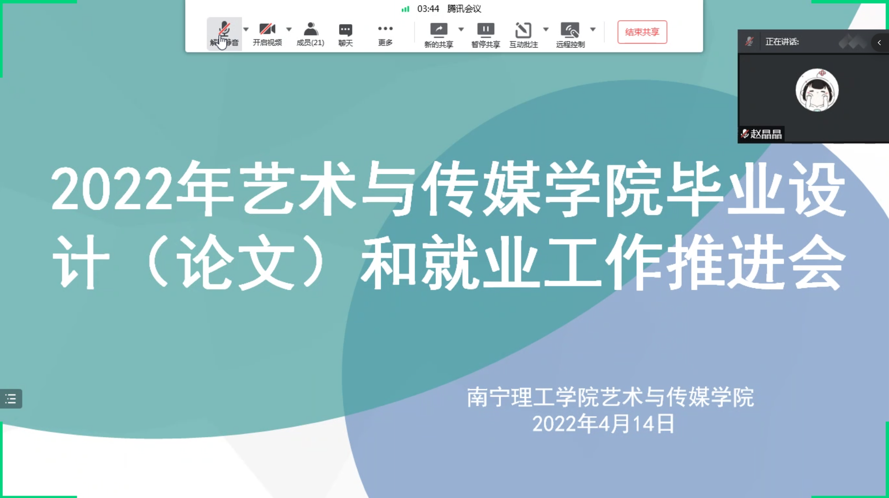 为深入学习贯彻党的十九届六中全会精神,落实党中央、国务院、教育部、自治区教育厅关于做好高校毕业生就业创业工作的重要决策部署,4月14日晚,艺术与传媒学院通过线上召开了2022届毕业设计(论文)和就……